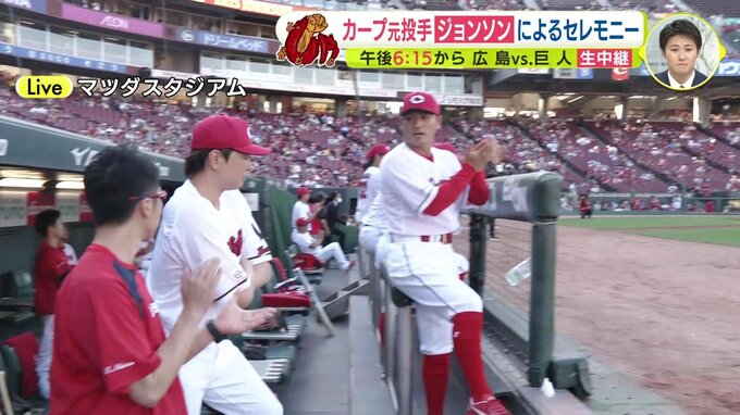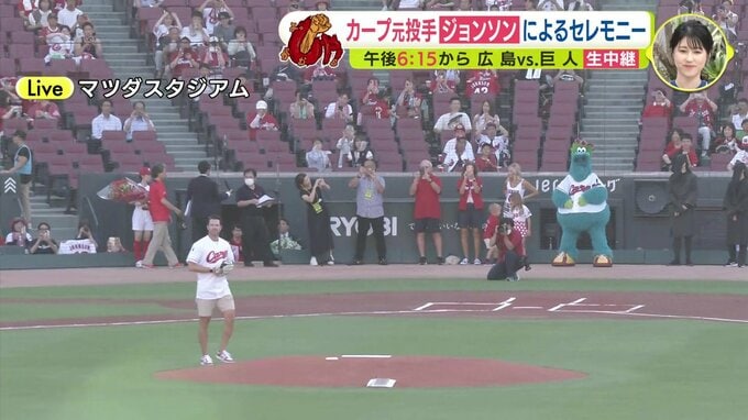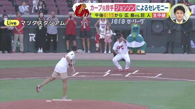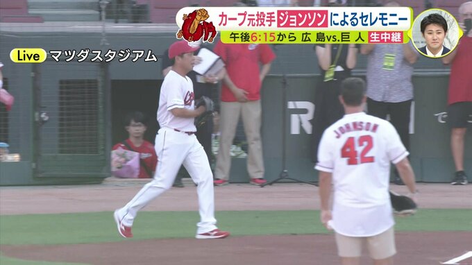 2015年にカープに入団して14勝7敗、最優秀防御率を獲得。そして2016年には外国人投手としては52年ぶりの2人目となります沢村賞も獲得したというクリス・ジョンソンさんのメモリアルピッチが行われます。上はユニフォーム、下は短パンいうことになりました。