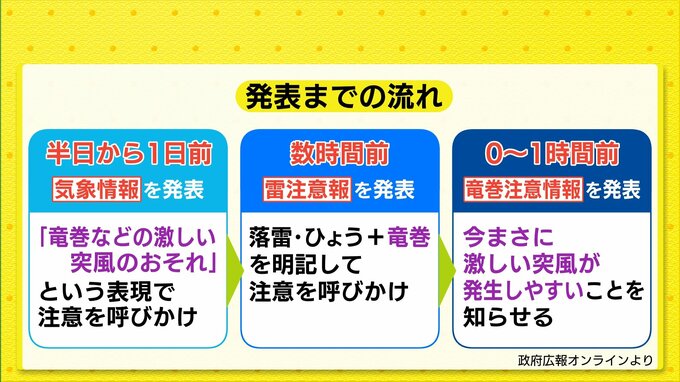 竜巻などの激しい突風などの危険が迫った場合、まずは気象情報が発表されます。これは発生の半日~1日程度前に発表され、情報には「竜巻などの激しい突風のおそれ」と明記されます。そして数時間前には雷注意報でも「竜巻」と明記されます。さらに危険が迫り、まさに竜巻等が発生しやすい状況となった段階で竜巻注意情報を発表します。