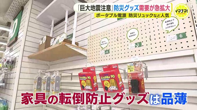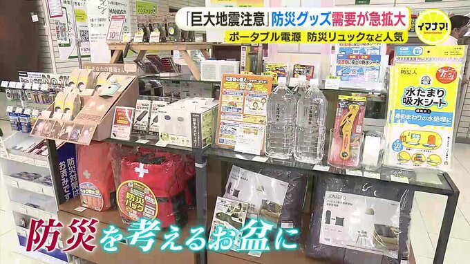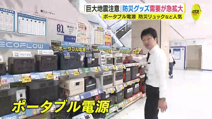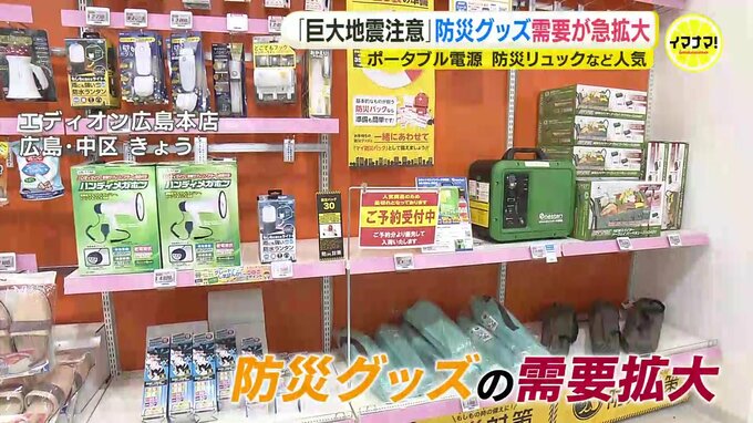 先週、「巨大地震注意」が発表され、広島市中区のエディオン広島本店では、防災グッズの需要が急拡大。すでに今月の売り上げは去年の同じ時期のおよそ20倍に伸びているということです。