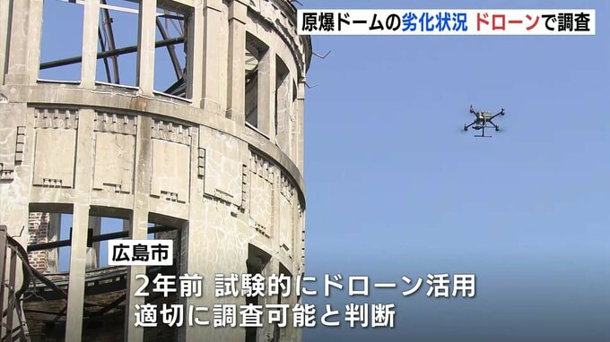 原爆ドームの劣化状況 ドローンを活用した初の調査 数千枚の画像を撮影し壁のひび割れなど確認 2024年8月26日(月) 12:03 国内 広島市は原爆ドームの壁のひび割れなど劣化状況を確認する調査で、今年度からドローンの活用を始めました。原爆ドームに向かって飛ぶドローン…。広島市は原爆ドームの劣化状況を確認する健全度調査を3年に1回実施…