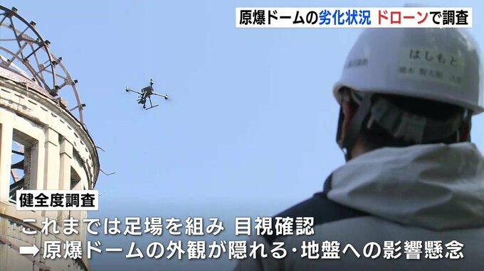 原爆ドームに向かって飛ぶドローン…。広島市は原爆ドームの劣化状況を確認する健全度調査を3年に1回実施しています。これまでは足場を組んで目視で確認していましたが、原爆ドームの外観が数か月間隠れることや、足場による地盤への影響が懸念されていました。