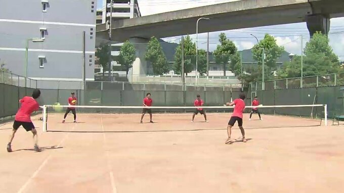ソフトテニス成年男子で出場するNTT西日本が、国スポのユニフォームを着用し、全体練習を行いました。3連覇中のチームにあって、エースの上松選手は、大会に向けての “秘密兵器” に磨きをかけていました。