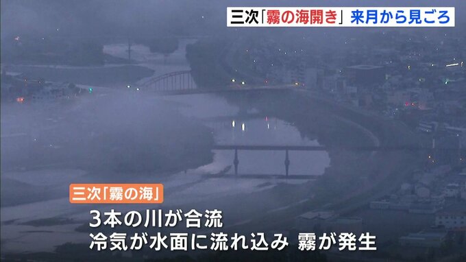 三次市中心部は、江の川など3つの川が合流する全国でも珍しい地形で、冷気が水面に流れ込むと町中すっぽりと濃い霧に覆われます。