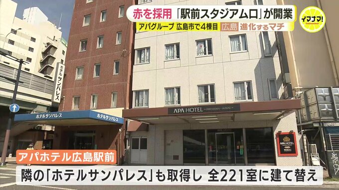 さらにアパグループの元谷社長兼CEOは、老朽化のため建て直す『アパホテル広島駅前』の、隣のホテルサンパレスの土地も買収し、合わせて221室とすることを明らかにしました。これで広島駅周辺で全5棟・2084室の展開を予定しています。