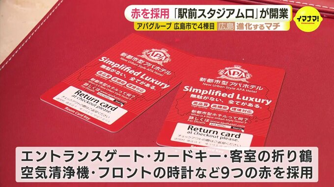 マツダスタジアムへのカープロード沿いに開業したのは『アパホテル広島駅前スタジアム口』です。全国のアパホテルで唯一、ゲートの色を赤くしたほか、カードキーや客室の折り鶴・空気清浄機・フロントの時計など、リーグ優勝9回のカープにちなんで9つの赤を採用しています。ホテルは地上14階建て、客室数は242でレストランなどを備えています。