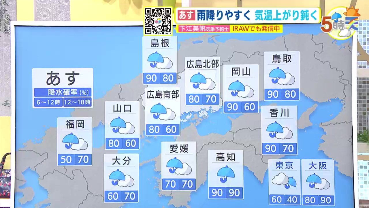 あすも本州付近に前線が停滞し、次第に北上する予想です。さらに前線上に低気圧が発生し、あすも湿った空気が流れ込みやすく、一日本降りの雨の予想です。日中は止み間もありそうですが、あすも大きめの傘でお出かけください。