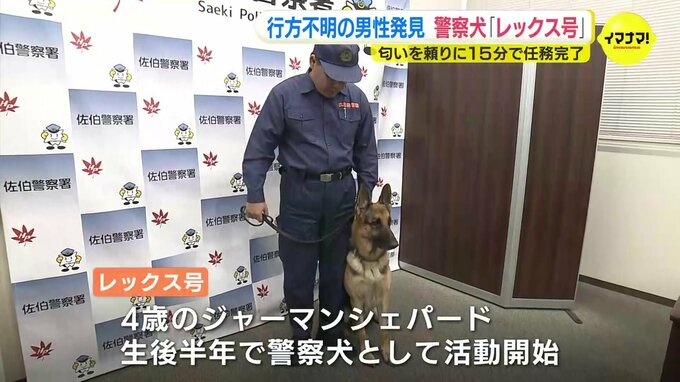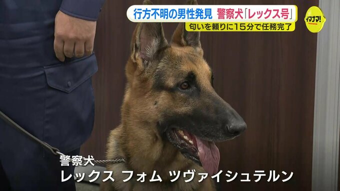 警察によりますと、午後3時ごろ、親族から「男性が自宅からいなくなった」と通報があり、警察官およそ20人が捜索していました。午後5時ごろ、現場に到着したレックス号は、男性のズボンの匂いを嗅ぎながら周辺を捜索。匂いを頼りに歩くことおよそ15分、自宅から少し離れた交差点で立ち止まっている男性を発見しました。