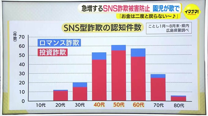 広島県内のことし1月~8月のSNS型詐欺の認知件数をみると、被害者の年齢層分布が40歳代から60歳代に集中していることがわかりました。