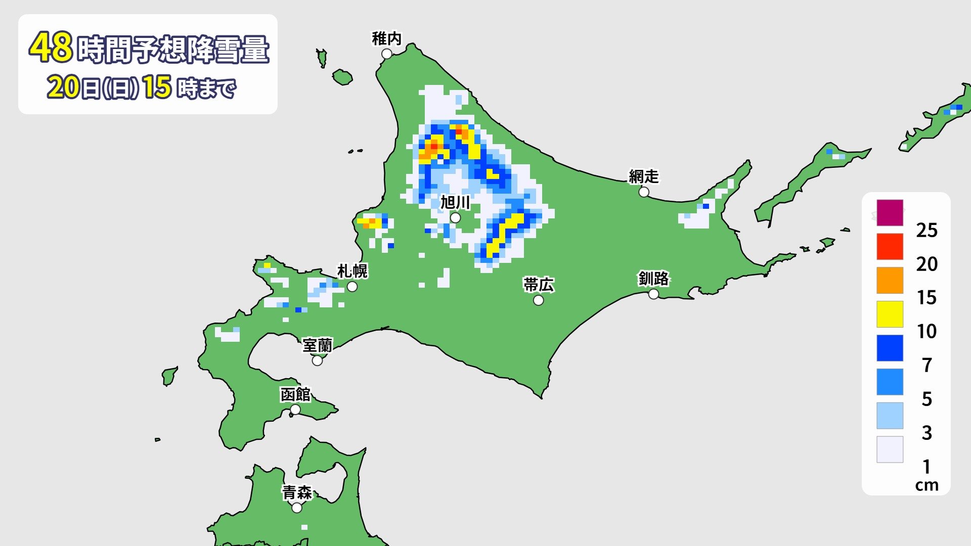 北海道地方では、19日夜から20日にかけて、標高の高い峠や山間部を中心に雪が降り、日本海側北部では、平地でも積雪状態となる所がある見込みです。積雪や路面凍結による交通障害に注意してください。