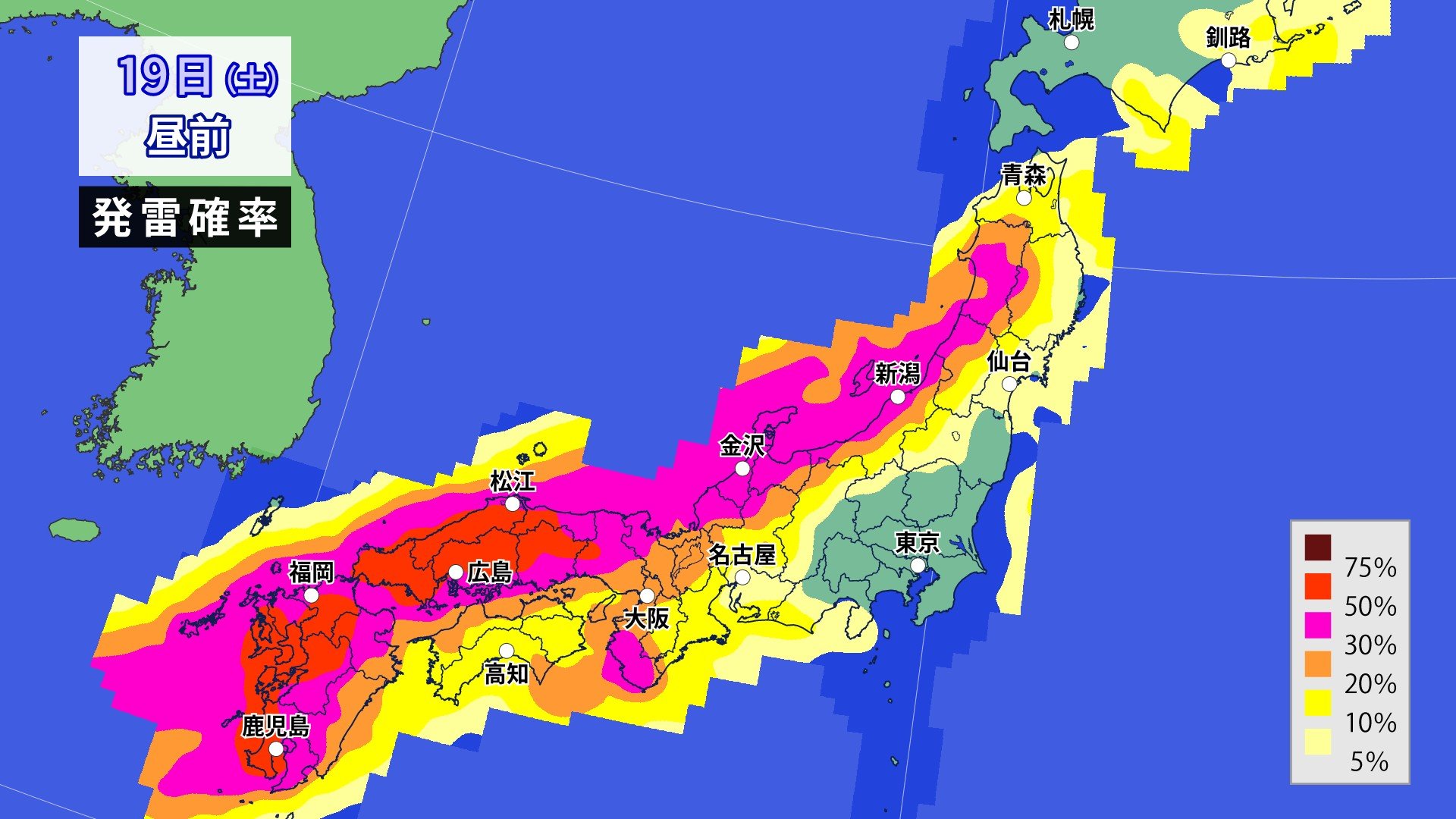 北日本から西日本では、19日(土)にかけて、落雷や竜巻などの激しい突風、降ひょうに注意してください。