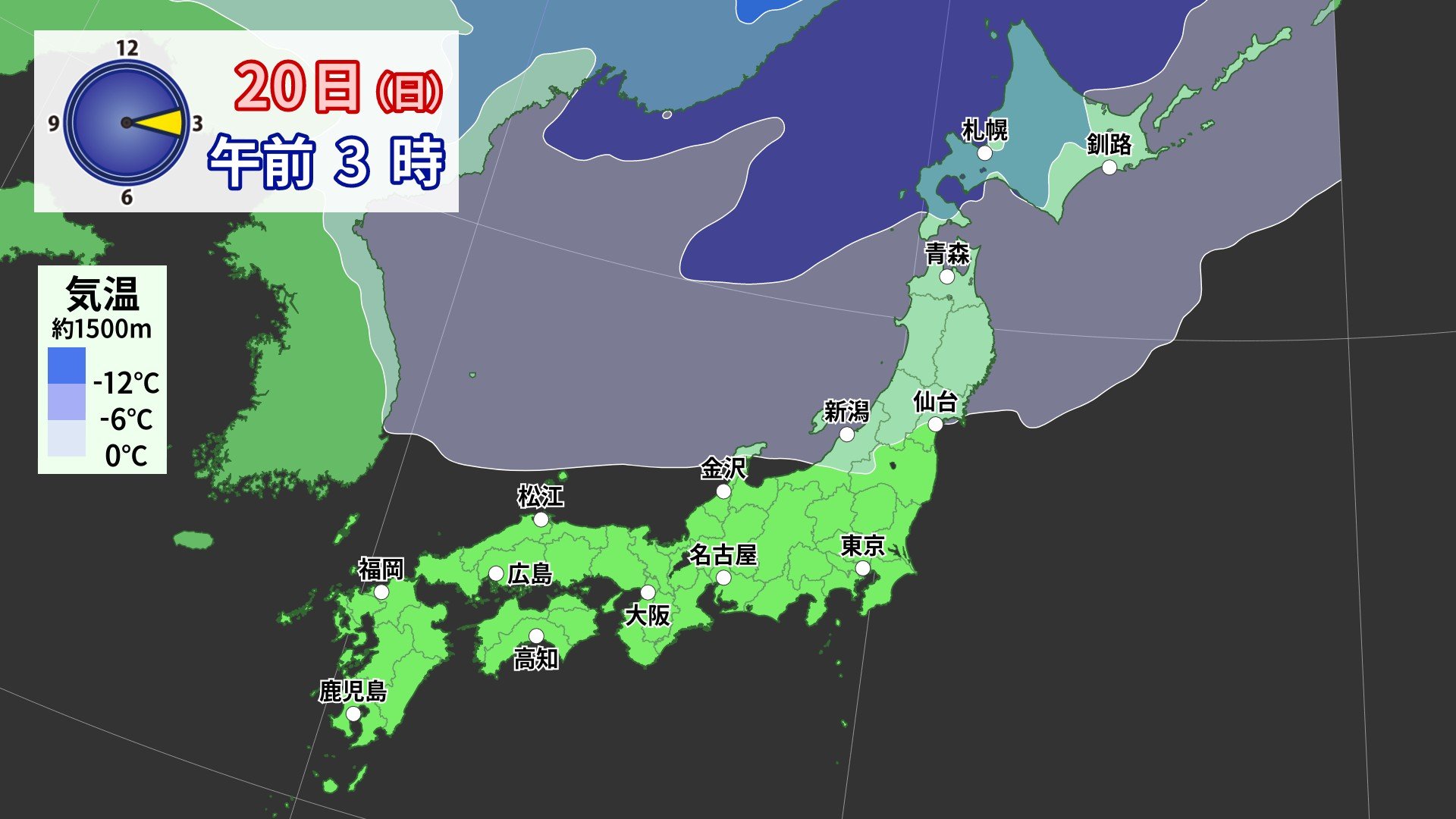 前線の通過後は北海道付では、一時的に西高東低の冬型の気圧配置なります。19日夜から20日にかけて、上空約1500メートルに11月下旬並の氷点下9度前後の寒気が入るでしょう。
