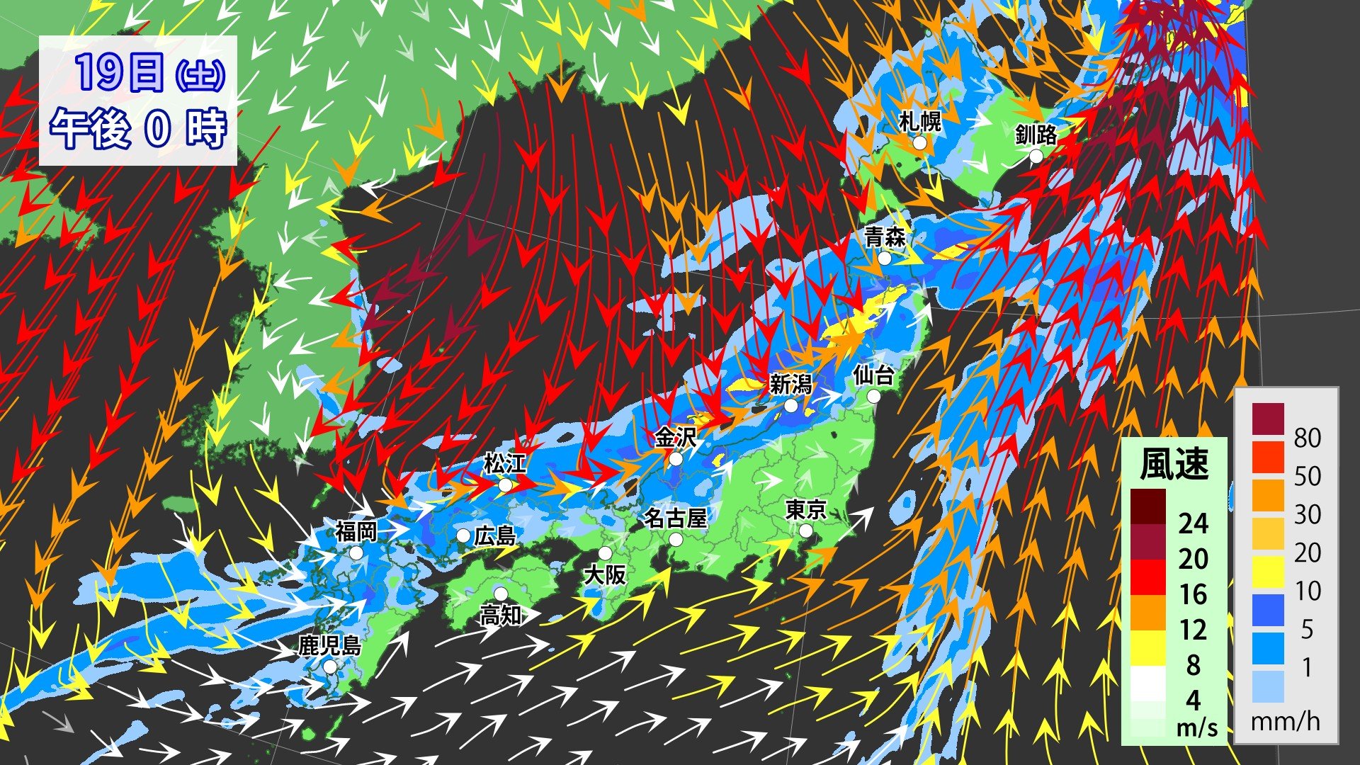 前線を伴った低気圧が、黄海にあって東北東へ進んでいます。19日にかけて、低気圧は発達しながら日本海から千島近海に進み、低気圧からのびる寒冷前線が北日本から西日本を通過する見込みです。北日本から西日本では、低気圧や前線に向かって暖かく湿った空気が流れ込むため大気の状態が非常に不安定となり、雷を伴った激しい雨が降る所があるでしょう。