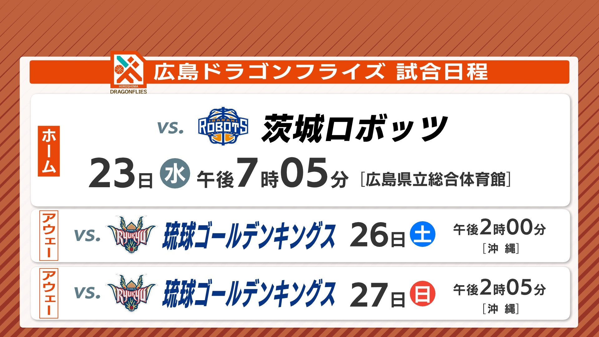 ― エバンスの復帰でようやく初勝利を挙げた広島ドラゴンフライズ。朝山ヘッドコーチもついに初勝利、これからが本番です。今週はあさって23日、今シーズン唯一の広島グリーンアリーナでの開催で茨城ロボッツを迎えます。さらに週末にはアウェイで西地区のライバル・琉球と対戦するハード日程が続きます。