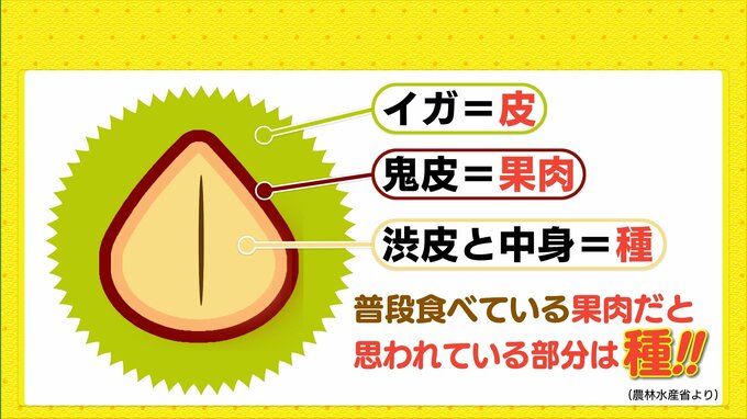 まずは栗の仕組みから。栗の一番外側の部分は「イガ」と言い、栗の皮にあたります。そして一般的に栗の皮と思われている部分が、鬼皮と言い、栗の「果肉」にあたります。実は、普段私たちが食べている部分は、渋皮と中身にあたります。そしてこの渋皮と中身はよく栗の果肉だと思われがちですが、この部分は実は「種」なんです。種を食べているというのは驚きですよね。