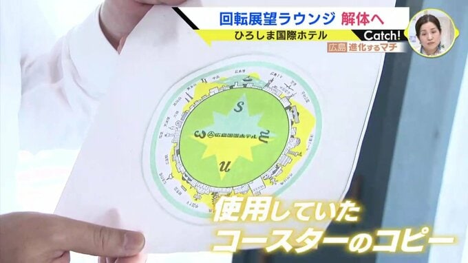 小林康秀キャスター「こちらは以前お店が開かれていた時に使われていた、コースターのコピーです。ここから見える風景がイラストで描かれています。例えば原爆ドームで書かれているが、ここから見ると銀行や証券会社のビルで見えません。そして広島城、さらには中国TVRCCと描かれていますが、実際にはRCCの白いタワー棟が市民病院の建物も向こう側にちょっと見えると、イラストの景色からはずいぶん様変わりようです」