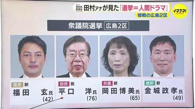 広島2区の候補者は4人。中でも最有力視されていたのは、通れば6期目、自民党の現職議員だった 平口洋 候補でした。投票を締め切る午後8時すぐに当確が出る予測もありましたが、この 福田玄 候補が追い上げたこともあって予想以上の接戦となりました。