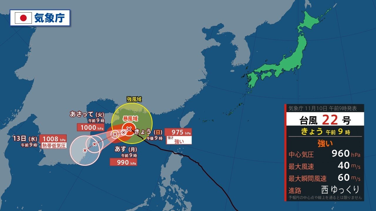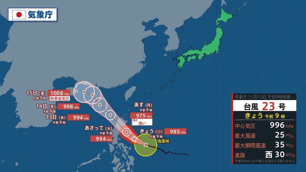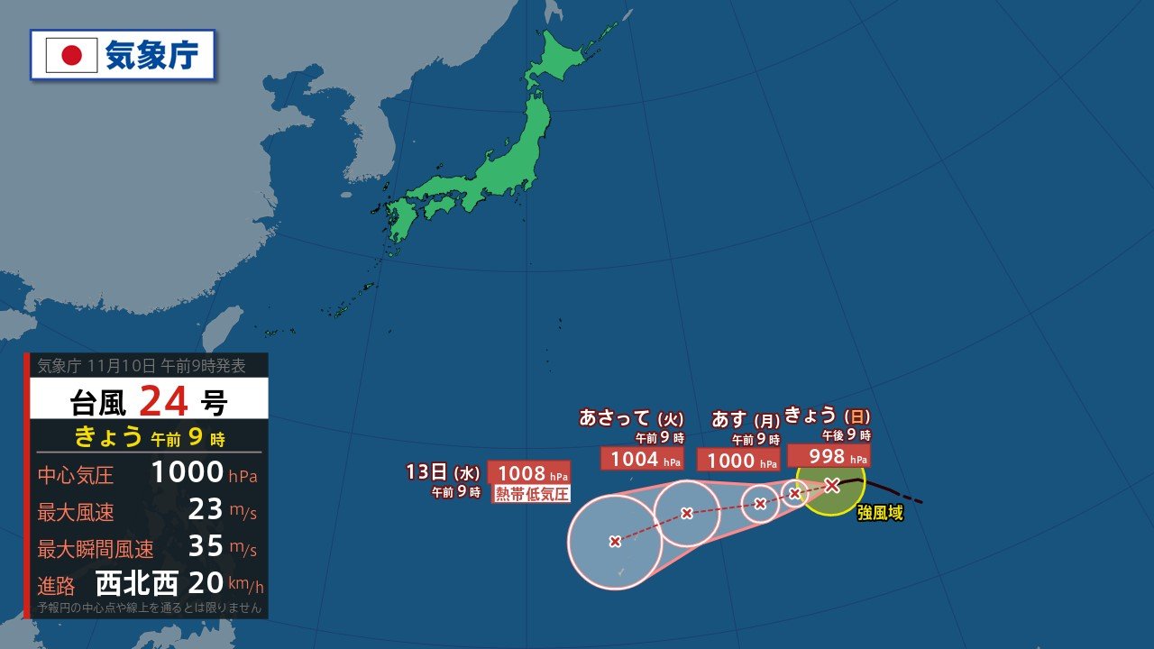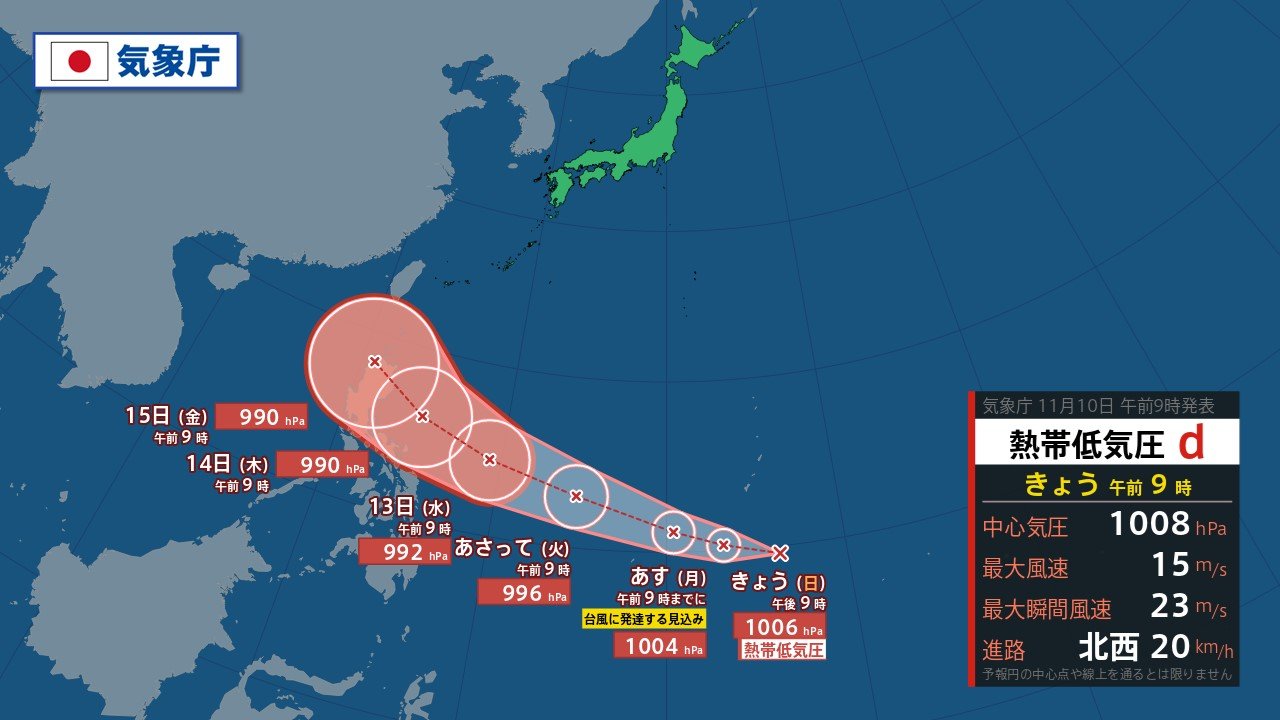 また23号と24号の間には別の熱帯低気圧が存在しています。気象庁は10日午前、この熱帯低気圧について24時間以内に台風25号になる可能性があるとして、進路予想の発表を始めています。