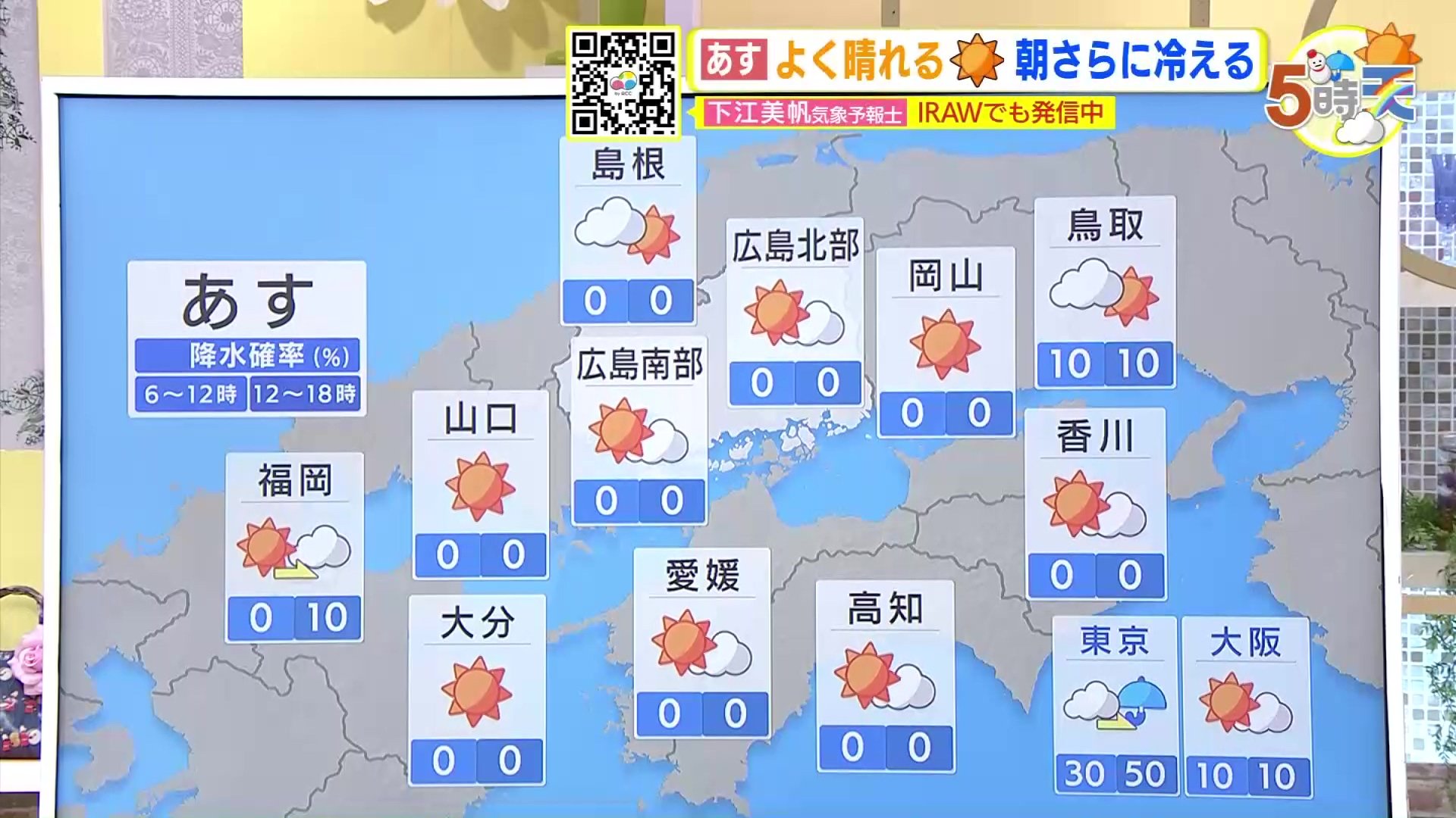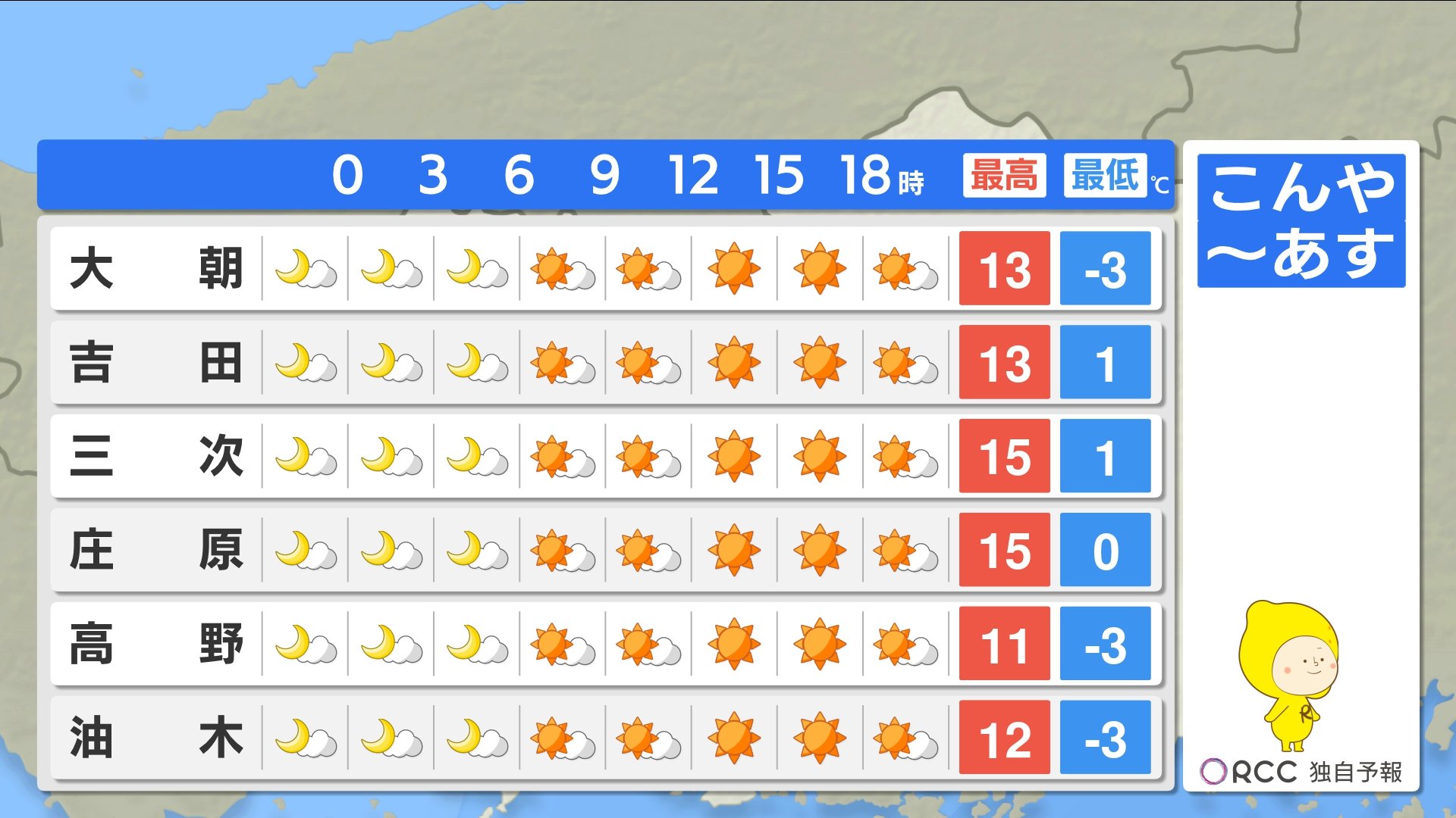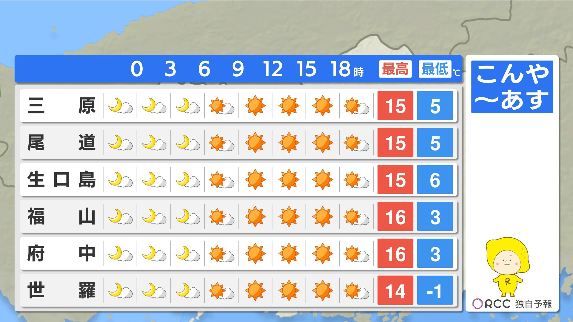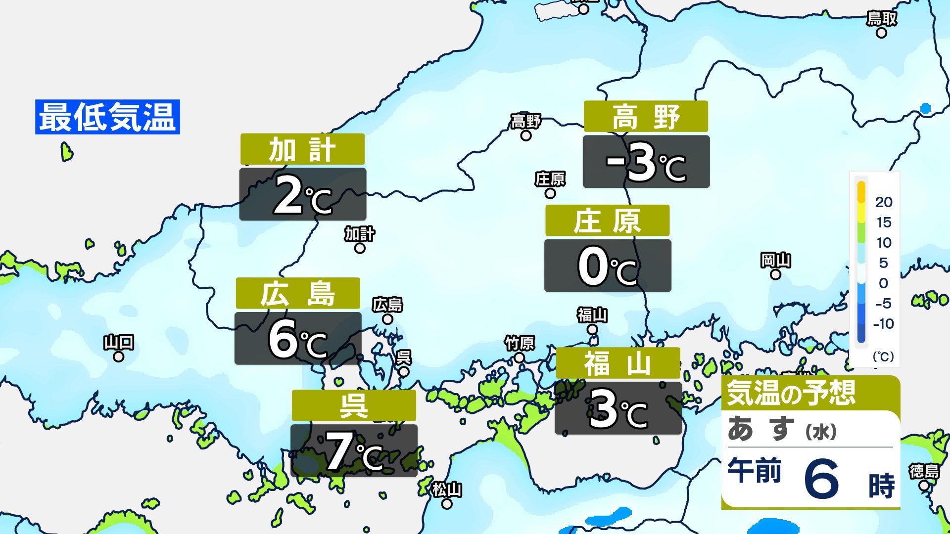 あすの最低気温は、北部内陸部では氷点下の地点も出てくる見込みです。広島市中区で6℃ 庄原で0℃など、各地で今日と同じくらいから5℃近く下がる地点もある予想です。風邪を引かないようご注意ください。