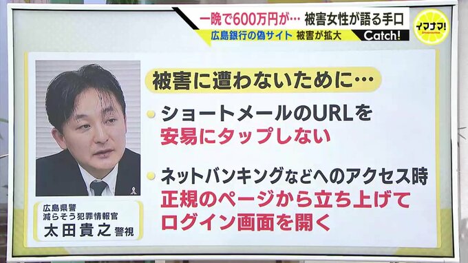 広島銀行は「今回のSMSは当行が発信したものではない」としたうえで「メッセージにあるリンクをクリックしたり、偽のサイトで契約者番号や口座番号などを絶対に入力しないでほしい」と注意を呼びかけています。