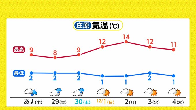 あすは次第に西高東低の冬型の気圧配置になる予想です。そしてこの先、週末土曜日にかけて上空を強い寒気を伴った渦が通過し、寒気が南下します。特にあさって金曜日はさらに強い寒気が南下し山地では雪が混じる可能性があります。すっきりしない天気が続き、北部ほど雲が広がりやすくしぐれ模様の予想です。日差しが届く時間もあり、変わりやすい空模様になるでしょう。
