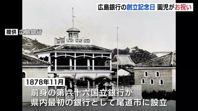 きょうで、146回目の創立記念日を迎えた広島銀行を広島市の園児たちがダンスと歌で祝いました。