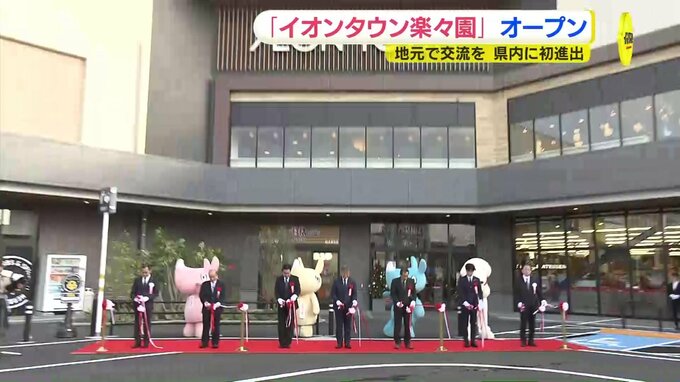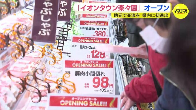 きょうオープンした、「イオンタウン楽々園」では、朝早くから詰めかけた人たちが、オープン価格の商品に殺到していました。のべ床面積およそ2万平方メートルには、食品スーパー「マックスバリュ」のほか、農産物を扱う「とれたて元気市」や、精肉の「植田商店」などの商品を、集中レジで買うことができる「楽々園マルシェ」など、中四国地方初出店の14店を含めた、あわせて71店舗が入ります。