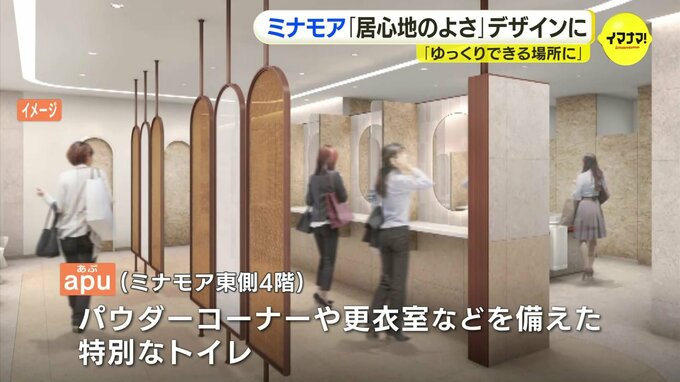 トイレは、館内12か所に設けられています。中でも、東側4階には「apu(あぷ)」と名付けられた化粧なおしができるパウダーコーナーや、更衣室などを備えた特別なトイレが設置されるということです。また、館内にはミナモアスタッフ専用の休憩室やコンビニなども設置されます。