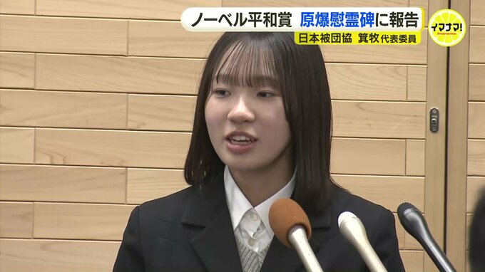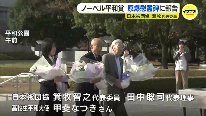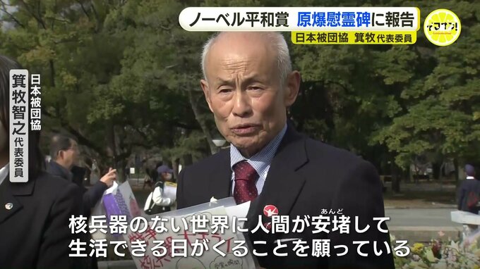 ノーベル平和賞を受賞した日本被団協の箕牧代表委員が18日、広島市の平和公園を訪れ、原爆慰霊碑に報告しました。