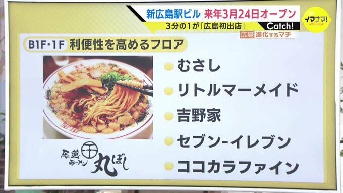 1階 モミジパティスリー・にしき堂・やまだ屋・リトルマーメイド・むさし・驛麺家・尾道ラーメン丸ぼし・おみやげ街道・リンガーハット・吉野家・キンコーズ・セブンイレブンハートイン・マクドナルド(2026年オープン予定)・ATMコーナー