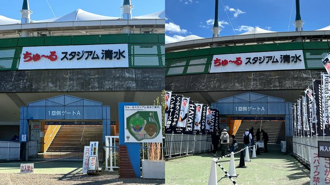 さて、この自主トレの地『ちゅ~る スタジアム清水』なんですが、左がきょう14日の写真で、右が去年のシーズン中のものです。新球団『くふうハヤテ』の本拠地になっているんです。なんで新球団の本拠地がこの球場になったかというと、あの菊池涼介さんが自主トレを張るぐらいだから、守備にこだわっている第一人者がやっている球場なのでグラウンドの状態がいいだろうということで本拠地になったと。