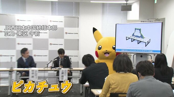 会見場に姿を現したのは人気ポケモンの「ピカチュウ」です。上郷社長と「ポケモンセンター」に関する計画を発表しました。