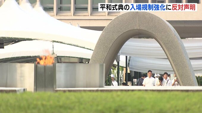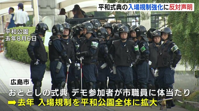 広島市は2023年の平和記念式典で、デモの参加者が市の職員に体当たりしたとされる事件を受けて、2024年は入場規制を平和公園全体に拡大し、拡声器などの持ち込みを禁止しました。