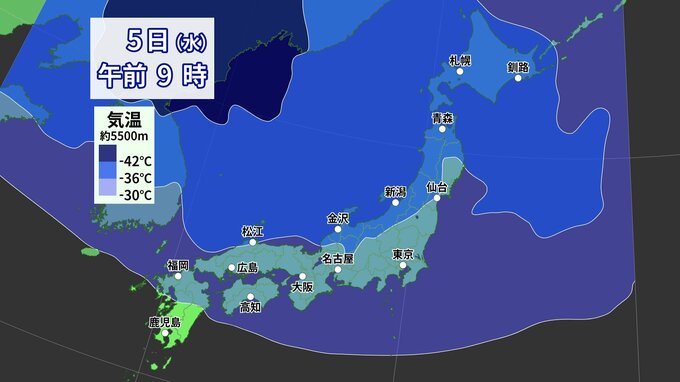 4日から6日頃にかけて、中国地方の上空約5000メートルには、氷点下36度以下のこの冬一番の強い寒気が流れ込み、冬型の気圧配置が強まる見込みです。