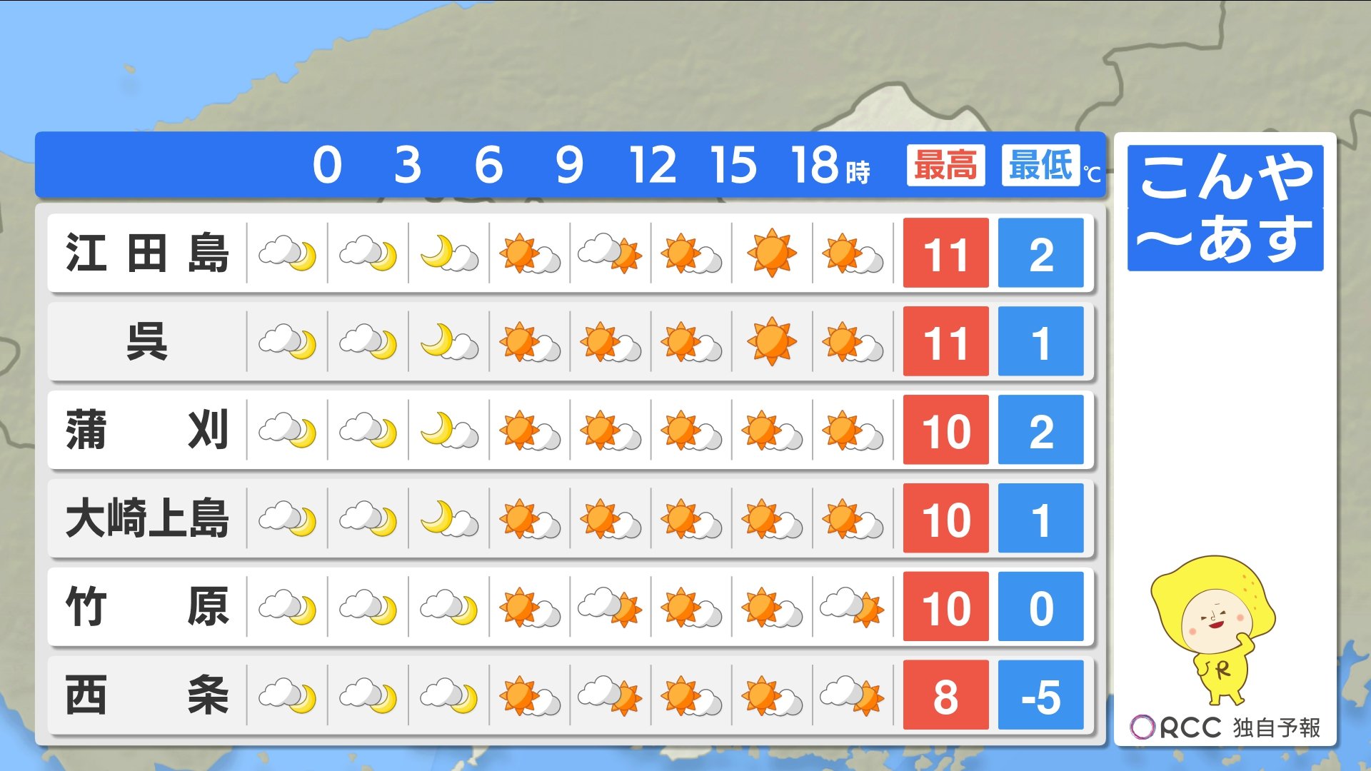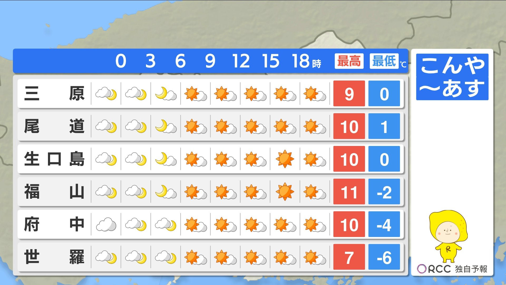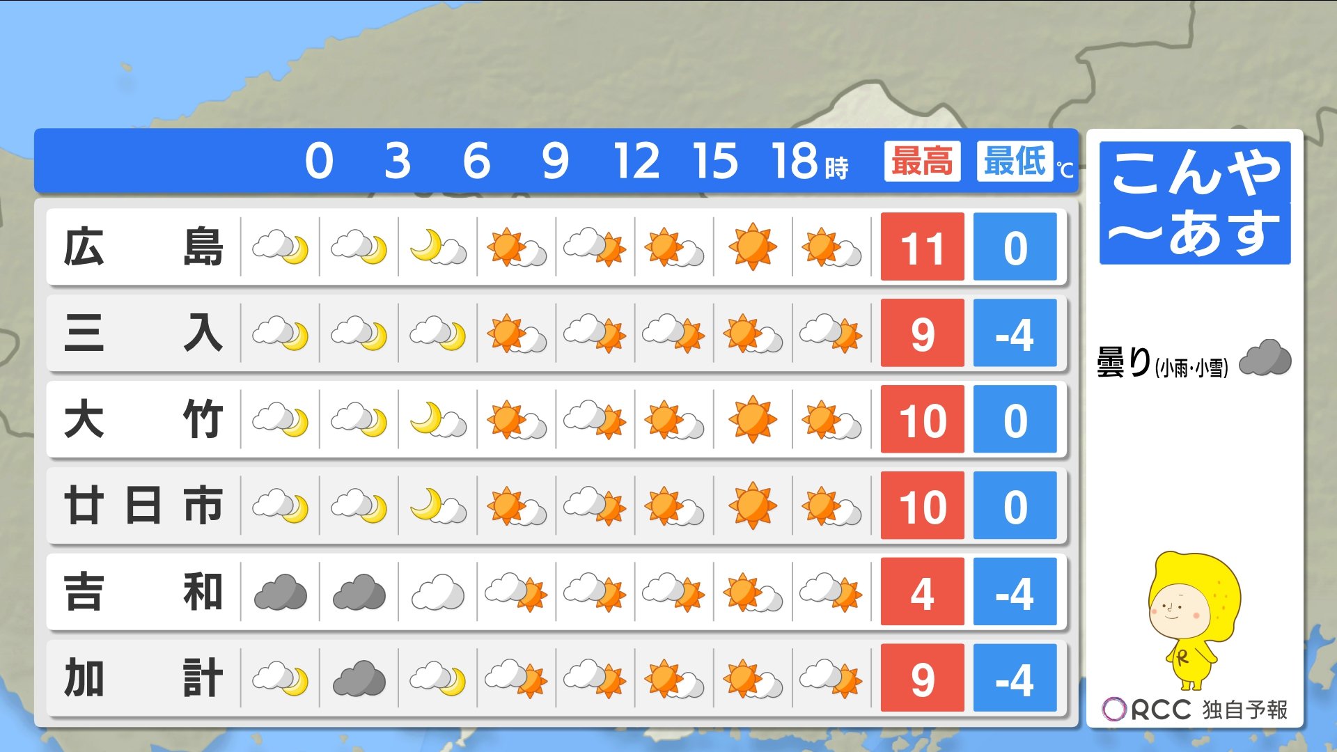 きょう10日(月)の広島県内は、寒波のピークは過ぎましたが、引き続き風が冷たく寒い一日となりました。特に朝晩の冷え込みは厳しく、最低気温は大朝で-8.6℃ 広島市中区で-1.1℃でした。