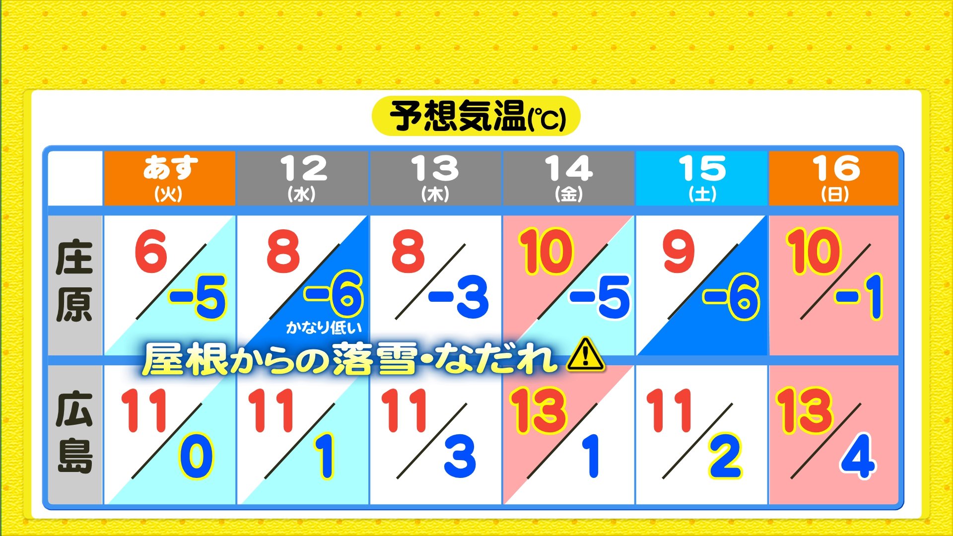 この週末も寒波の影響が続き、最深積雪は北広島町八幡で162センチ 高野で137センチを記録しました。また最低気温は、廿日市津田で-11.3℃ 世羅で-10.4℃ 広島市中区で-3.5℃等 各地で今季一番の冷え込みになりました。