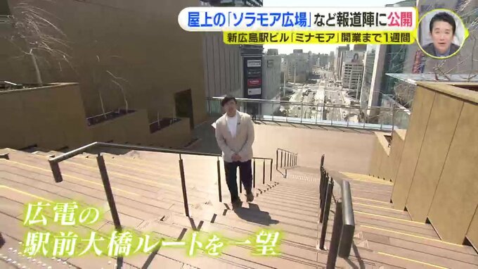 「ソラモア広場につながる大階段です。南口を見渡してみると、広電の駅前大橋ルートを一望できます。まだまだ工事途中ですが、いよいよ夏に完成予定です。