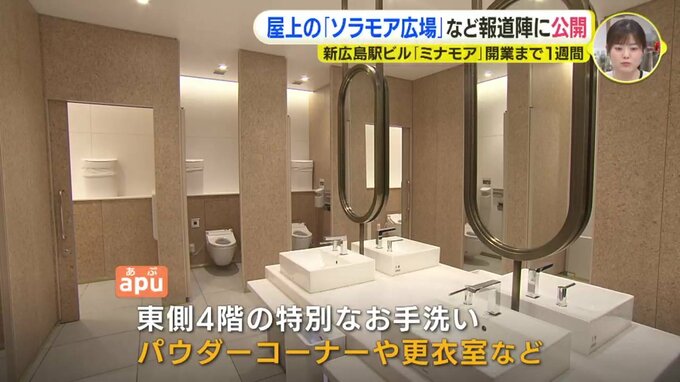4階の東側には、「apu(あぷ)」と名付けられた特別なトイレがあります。ゆったりと化粧直しができるパウダーコーナーや、結婚式の二次会などにも利用できる更衣室が用意されています。
