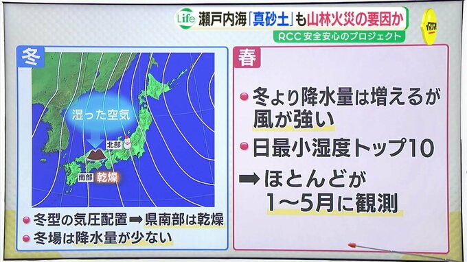 そして、冬と春は火事の発生しやすい気象条件となります。冬は「西高東低」の気圧配置になり、日本海の湿った空気を含んだ北風が中国山地に吹き付けて、雪を降らせます。一方、南部では、乾いた空気となり、雨が少なく、乾燥します。