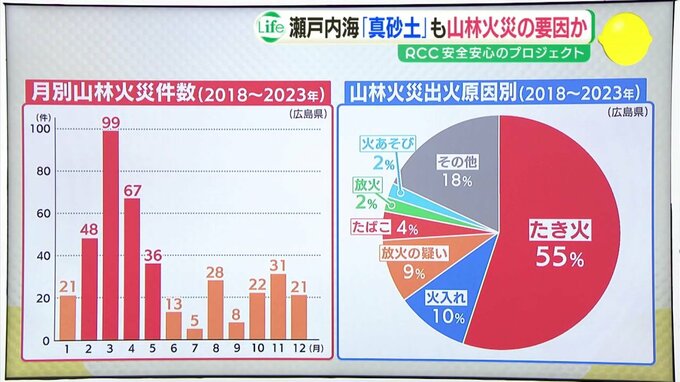 広島県によると、過去5年間の県内の山林火災件数は、2月~5月の期間に増えています。出火原因は「たき火」が55%、「火入れ(枯れ草などの野焼き)」が10%などとなっています。
