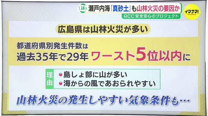 広島県は、山林火災が多い県です。過去35年間のうち29年間は、都道府県別でワースト5位になっています。島しょ部で山が多く、海からの風であおられやすいことが背景にあります。