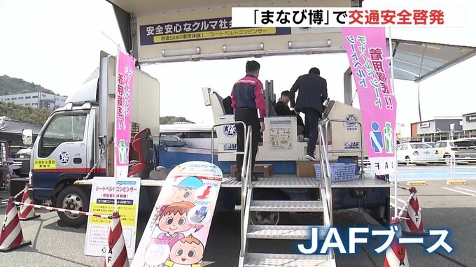 JAF=日本自動車連盟のブースでは、シートベルト着用の効果を体験する装置がありました。衝突速度は(時速)5キロですが…。