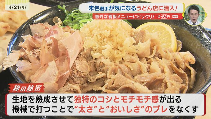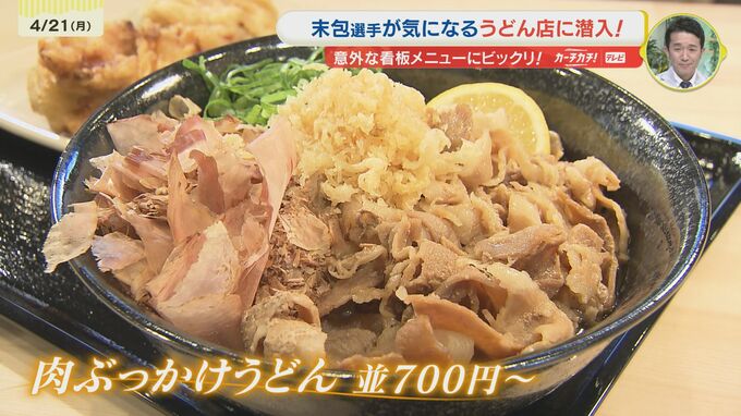 高野豆腐の天ぷらも気になりますが、天谷さんがこれから頂くのはこちら、たっぷりのお肉に鰹節が香る、看板メニュー「肉ぶっかけうどん」です!