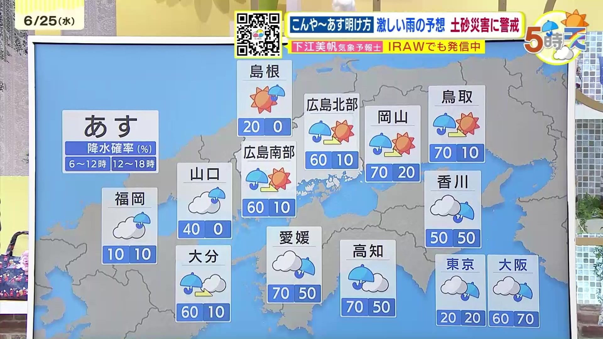 きょう25日(水)の広島県内は、午後から再び活発な雨雲がかかった所が多く、局地的に雷を伴い激しく降ったところもありました。日中の気温は、府中市で32.9℃ 福山市32.2℃まで上がり、かなり蒸し暑くなりました。