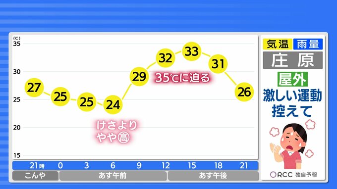 あすも熱帯夜の地点が出る予想で、広島市中区では4日連続の熱帯夜となるでしょう。夜間の熱中症に注意が必要です。エアコンはつけっぱなしにして寝ることが推奨されています。また、近くに常温の水を置いて、寝る前やトイレで起きた際にこまめに水分を補給できるようにしておきましょう。