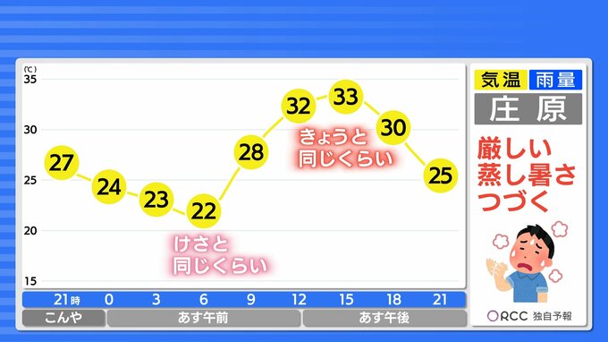 あす朝にかけても沿岸部を中心に熱帯夜の地点が多くなる見込みです。寝苦しい夜が続くでしょう。あすも35℃前後まで気温は上昇し、厳しい蒸し暑さが続きます。屋外の活動はできるだけ控えるようにしてください。また、屋外のレジャーは適宜休憩を取って、こまめな水分補給を忘れずにお願いします。熱中症に厳重に警戒しながらお過ごしください。