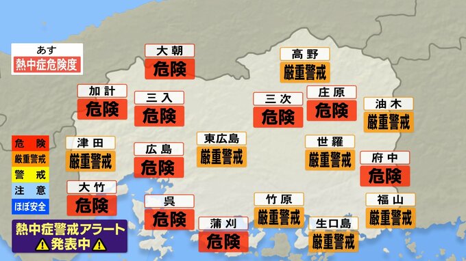 あす朝にかけてもほとんど気温が下がらず、かなり寝苦しく感じられそうです。エアコンを適切に使用していただき、夜間の熱中症に十分ご注意ください。あすも県内は熱中症警戒アラートが発表されています。引き続き危険な暑さに警戒してください。危険レベルの地点に関しては、不要不急の屋外の活動は原則中止でお願いします。