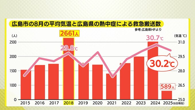 広島市内の8月の平均気温と広島県内の熱中症による救急搬送数の推移です。2018年は平均気温が29.8℃、西日本豪雨災害が起きた年ですが2,661人が熱中症により救急搬送されました。そして今年・・・まだ7月入ったばかりなんですが、平均気温はすでに30.2℃、589人が救急搬送されています。去年同時期と比べておよそ1.7倍のペースです。過去のデータは8月の平均気温、年間の救急搬送数なので、このペースでいけば去年を大きく上回る可能性があります。心配ですね・・・