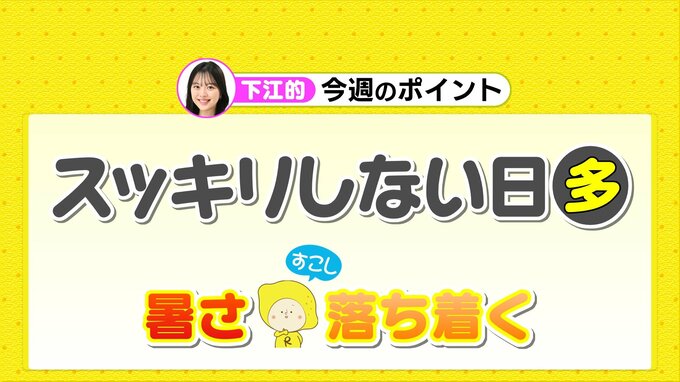今週は不安定な空模様の日が多く、特に木曜日と金曜日はすっきりせず、雨が降る時間があるでしょう。土曜日頃にかけて、日中の気温は30℃~33℃くらいで、先週と比較するとやや気温は低くなりますが、厳しい暑さが続くでしょう。こまめな水分補給やエアコンの適切な使用など、熱中症に警戒しながらお過ごしください。