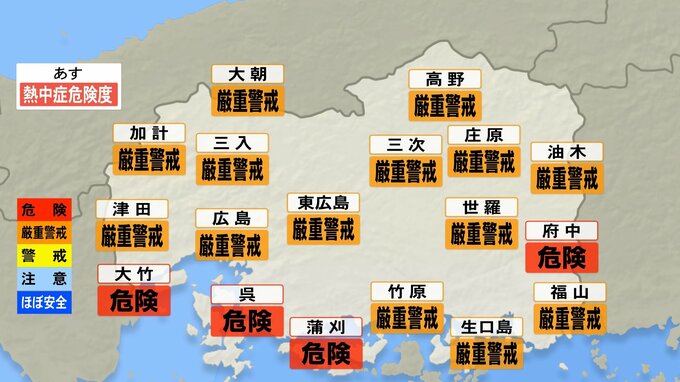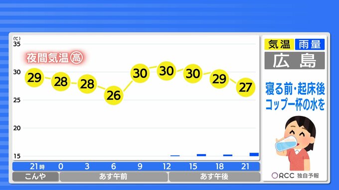 南部では夜間の気温が高く、広島市中区はあすも熱帯夜となる見込みです。夜間もエアコンを使用していただき、熱中症に注意してください。日中の気温は、きょうより2℃~3℃ほど低くなりますが、雨で湿度が高くかなり蒸し暑くなるでしょう。