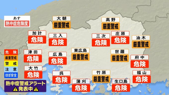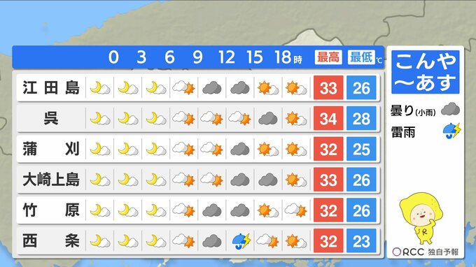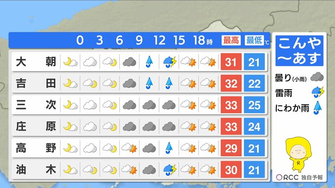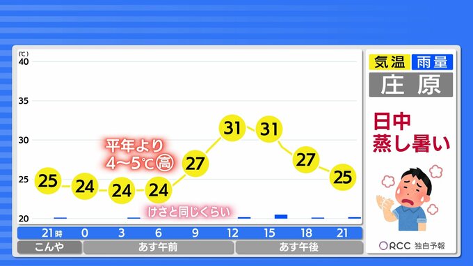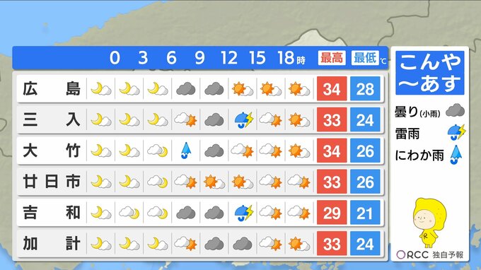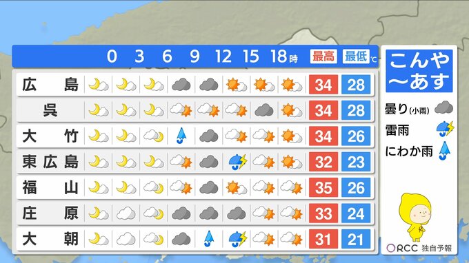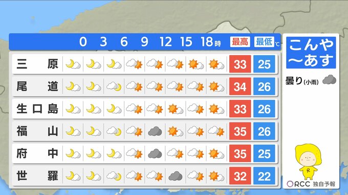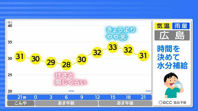 沿岸部を中心に熱帯夜が続いており、広島市中区ではけさまでに14日連続で熱帯夜となっています。夜間の熱中症に引き続きご注意ください。また、北部の最低気温も高い傾向が続いています。庄原の最低気温は、あすにかけても平年より4℃~5℃ほど高い予想です。日中の気温も高く、厳しい蒸し暑さが続きます。時間を決めてこまめに水分補給・塩分補給を心がけましょう。